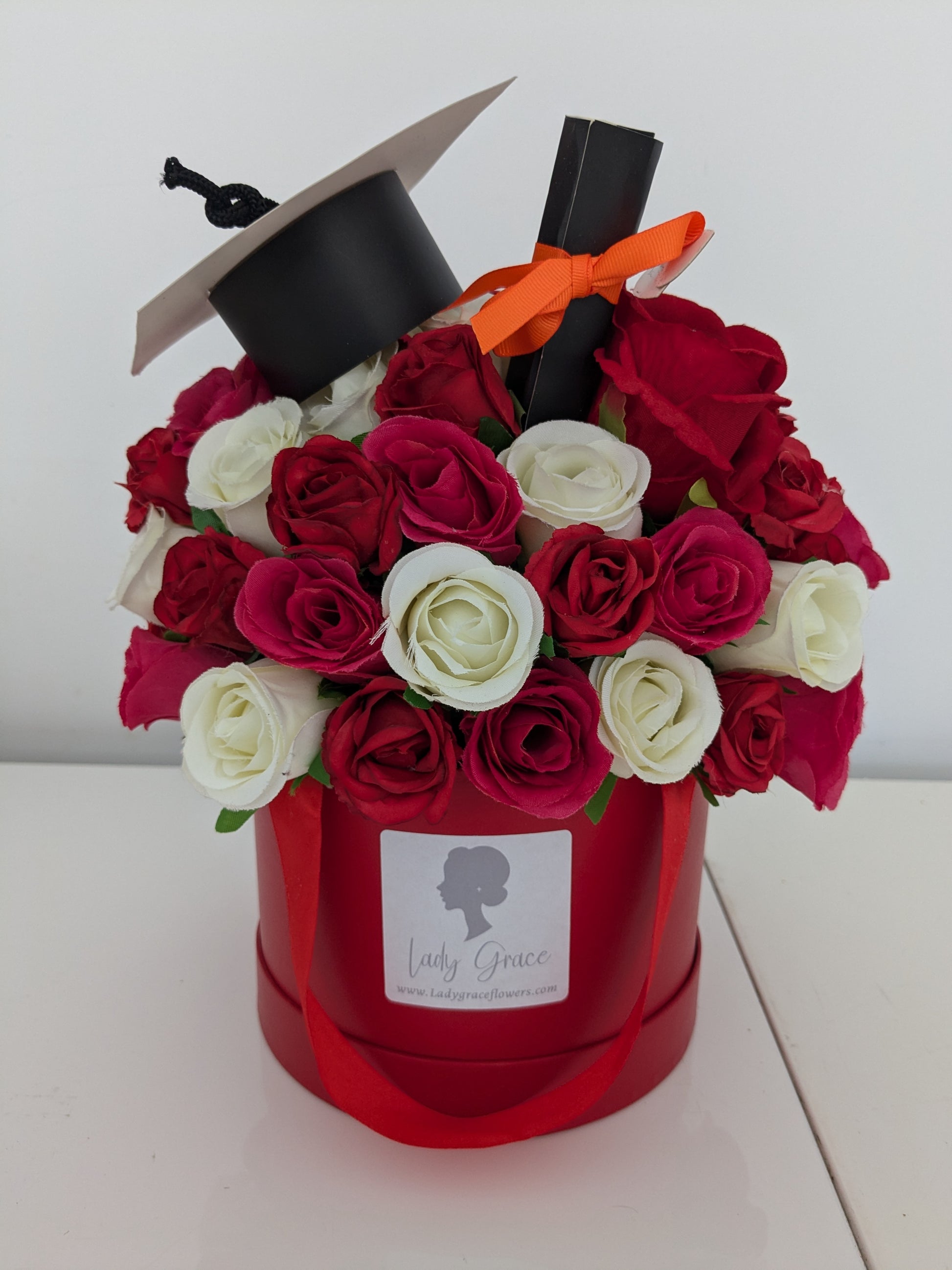 Graduation Red & Cream Hat Box of Joy Silk Flowers Gift