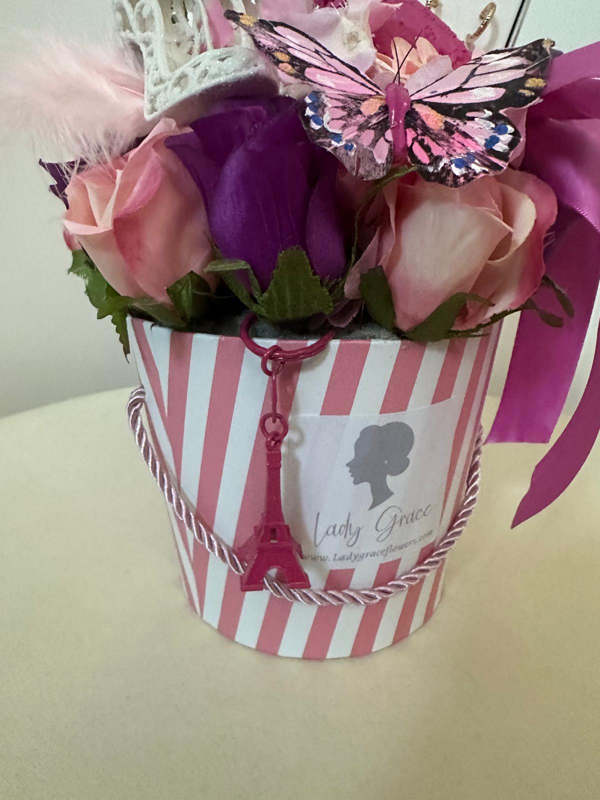 This beautiful hat box is the perfect gift. Made with luxury silk flowers and greenery.