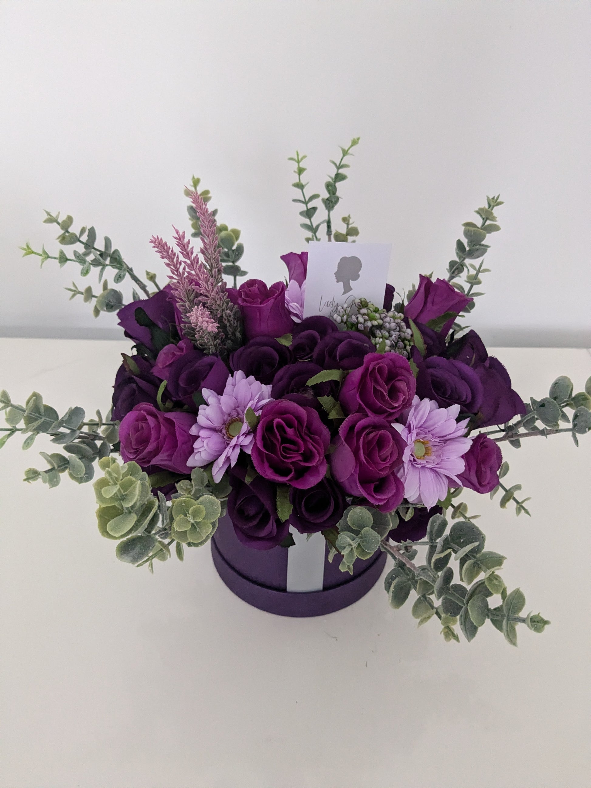 This beautiful hat box is the perfect gift. Made with luxury silk flowers and greenery.
