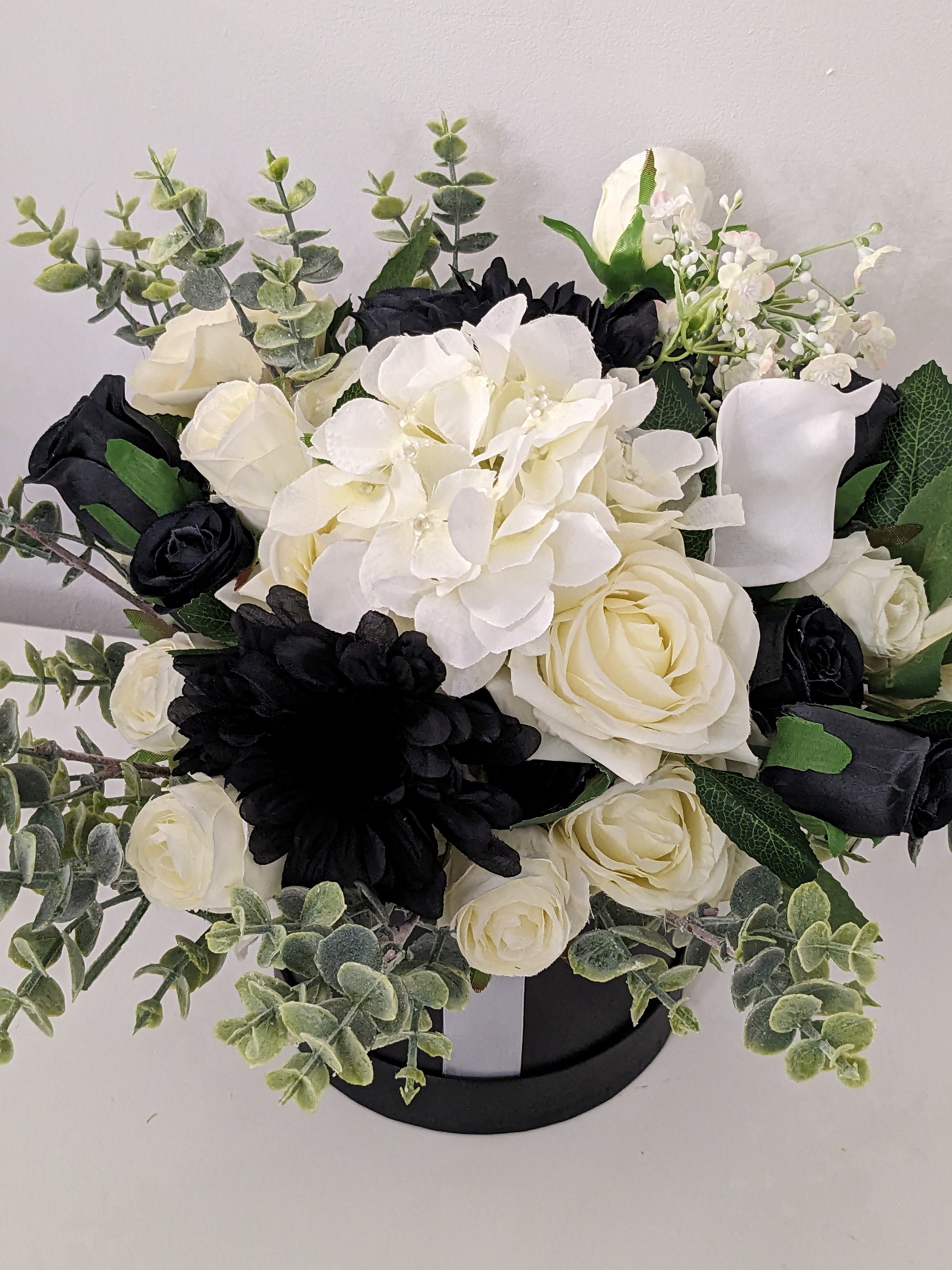 This beautiful hat box is the perfect gift. Made with luxury silk flowers and greenery.