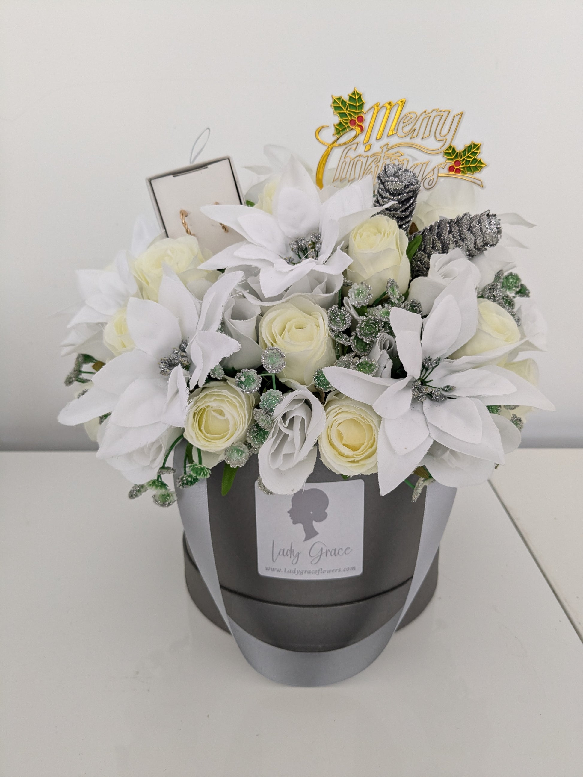This beautiful hat box is the perfect gift. Made with luxury silk flowers and greenery.
